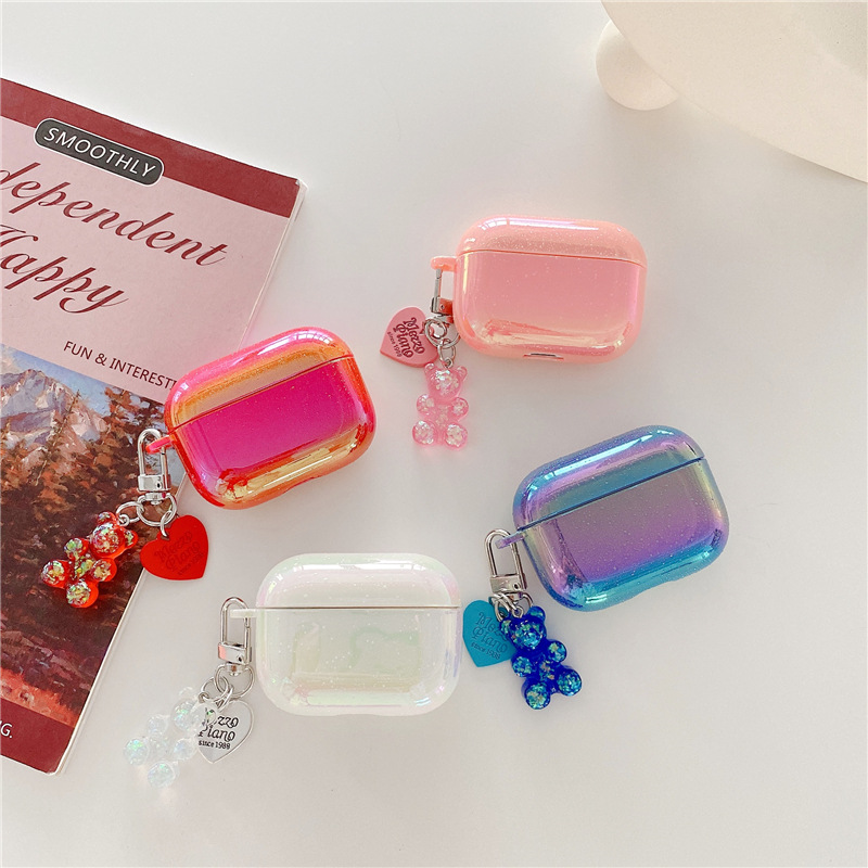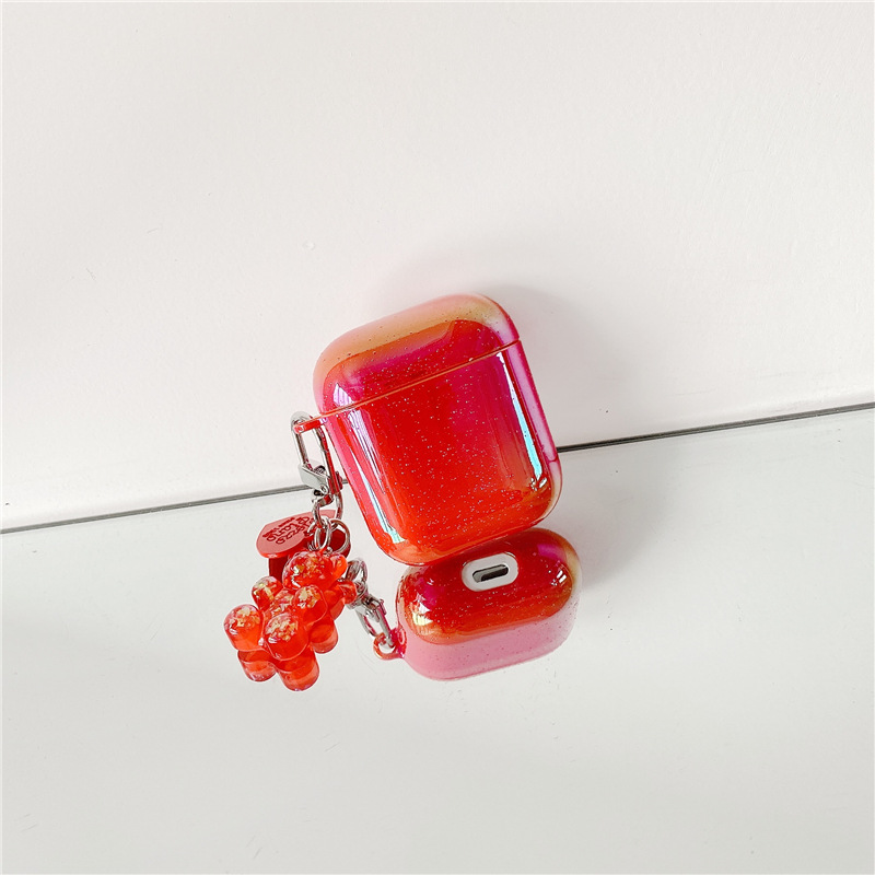オーロラグラデーションエアーポッズケースは、光沢感とラメが織りなす華やかなデザインが魅力。かわいいクマチャーム付きでバッグやポーチに取り付けられるので、紛失防止にも役立ちます。